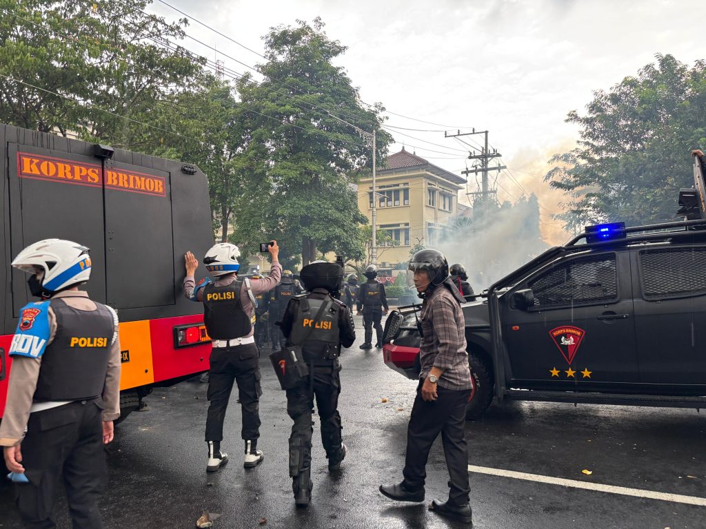 Aksi tersebut memicu reaksi massa lain yang kemudian ikut melakukan tindakan anarkis, merusak fasilitas umum seperti pagar, lampu taman, dan pot bunga, lalu melemparkannya ke arah petugas di dalam Mapolda. Petugas berulang kali menghimbau melalui pengeras suara agar massa menghentikan aksi anarkis, namun tidak diindahkan.